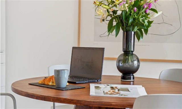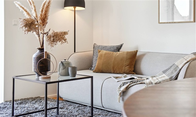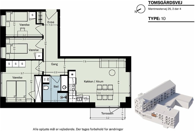 The apartments on Tomsgårdsvej are fitted with soundproof windows to minimize noise. Kitchens and bathrooms feature white JKE cabinetry with integrated handles, while the bathrooms are adorned with large, sleek stone brown tiles. Additionally, the shower areas include built-in shelves with integrated lighting. All residences come equipped with underfloor heating and plank flooring. Each home is supplied with a complete set of white goods, including a washer and dryer stack. Residents also benefit from access to storage rooms located in the attic.Ground-floor units offer direct access to private terraces elevated above ground level. These personal outdoor spaces are complemented by a charming, enclosed communal area featuring lush greenery, sandpits, and a greenhouse. The top-floor apartments on Tomsgårdsvej provide stunning views over the neighborhood and an unobstructed sky.