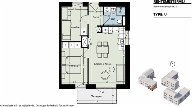 Step inside this lovely apartment featuring two spacious bedrooms, each equipped with built-in closets. The bathroom includes a toilet, shower area, and a combined washer-dryer unit. A bright, open-plan kitchen and living space provides direct access to a private terrace, offering a perfect spot to enjoy the summer months.The building complex offers terraces or balconies for every residence, along with shared rooftop terraces. Situated within the courtyard of Møntmesterhus, the surroundings promise an engaging and ever-changing atmosphere. The apartments vary greatly in size, layout, accessibility, and location, allowing for a diverse community of residents. Additionally, the property is complemented by a café or retail space facing Rentemestervej.