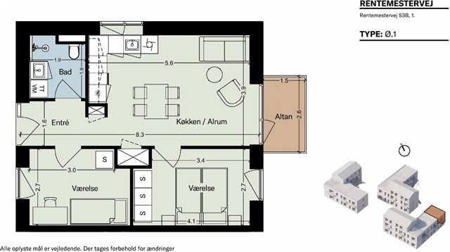 Step inside this charming apartment featuring two spacious bedrooms, a bathroom equipped with a toilet, shower enclosure, and a combined washer-dryer unit. The accommodation also includes a large, bright open-plan kitchen and dining area that opens onto a balcony, providing an ideal spot to enjoy the summer months.The building complex offers each residence either a terrace or a balcony, alongside shared roof terraces accessible to all residents. Situated within the courtyard of Møntmesterhus, the environment is designed to be lively and ever-changing. The apartments vary significantly in size, layout, access configurations, and location, which supports a diverse community of residents. Complementing the residential properties, there will be a café or retail outlet facing Rentemestervej.