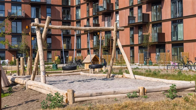 The building, known as Green Hills, is a visionary residential project designed by the award-winning Danielsen Architecture firm, named after its distinctive hill-shaped form. Nestled between these hills lies a courtyard spanning approximately four hectares that includes a small lake, rolling terrain, and a zip line. This area offers numerous spots designed both for play and peaceful moments, catering to all ages.