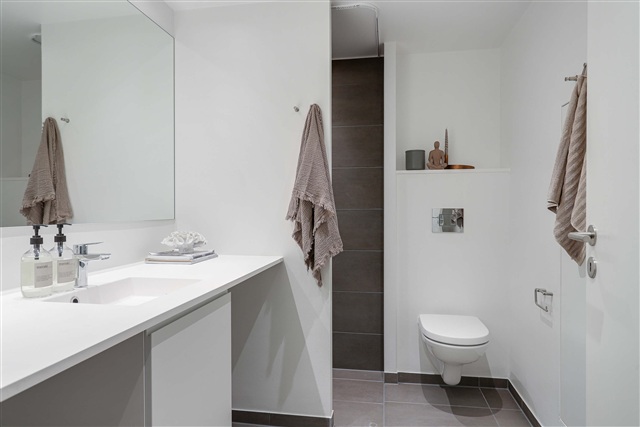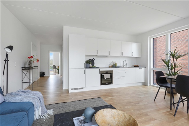 The apartments at I Terrassen, ranging from two to four rooms in Kirkebjerg Søpark, offer suitable living spaces for singles, families with children, or seniors alike. Designed with contemporary, well-considered layouts, these homes maximize the usability of every square meter. Central to each residence is a spacious kitchen-dining area that opens onto a private balcony or terrace, providing views oriented either to the south or the west. Additionally, residents benefit from convenient parking options located within one of the two parking garages nearby.