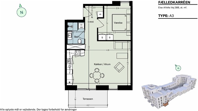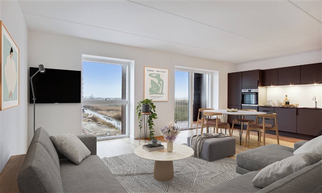 This residence features a distinctive olive-green Invita kitchen, a rarity in this development. Equipped with Electrolux appliances, some kitchens include an elevated oven to enhance ergonomic comfort during food preparation. The bathroom continues the olive-green theme, lending a serene and natural atmosphere to the space. It comes fitted with a washing machine and tumble dryer from Electrolux. The entire home boasts oak flooring complemented by underfloor heating. Built-in wardrobes provide ample storage capacity, and each unit is accompanied by a storage room located either within the apartment or in the basement.Positioned atop this remarkable building and viewing platform, residents have access to two expansive south-facing communal rooftop terraces that offer unobstructed views over Fælleden. Fælledkarréen stands out with its unique architectural design, spectacular sights of Kalvebod Fælled, and fosters a close-knit community environment.
