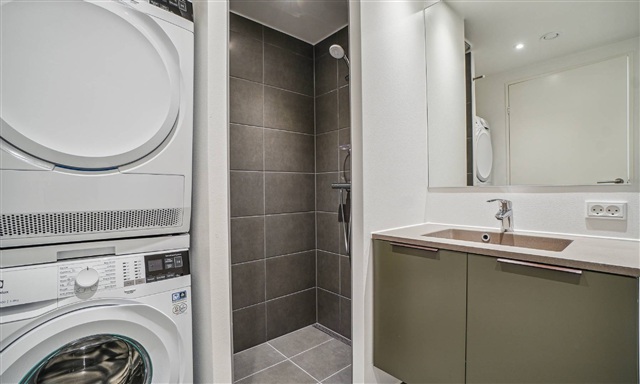 Within this development, you will find a distinctive olive green Invita kitchen, a rare feature that sets this residence apart. The kitchen is outfitted with Electrolux appliances, and in select units, the oven is positioned higher to enhance ergonomic use. The same olive green hue is echoed in the bathroom, creating a serene and natural ambiance. Both a washing machine and a dryer from Electrolux are included in this space.The flooring throughout the home is crafted from oak and complemented by underfloor heating for added comfort. Ample storage is provided by built-in wardrobes, while every apartment benefits from an additional storage room located either within the unit itself or in the basement.