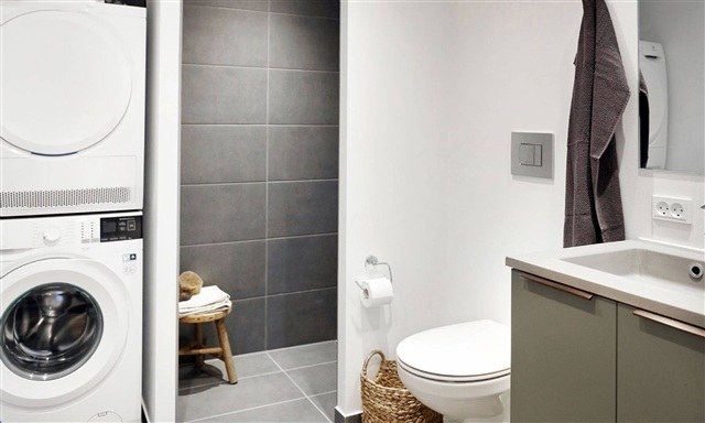 This residence features a distinctive olive green Invita kitchen that sets it apart. The appliances, all from Electrolux, include ovens that, in some kitchens, are mounted higher than usual to enhance ergonomic comfort. The bathroom continues the olive green theme, creating a serene and natural ambiance, and is equipped with both an Electrolux washing machine and dryer.Throughout the home, the flooring consists of oak with underfloor heating installed underfoot. Efficient storage solutions are provided by built-in closets, and additionally, every unit includes a storage room, either integrated within the apartment itself or located in the basement.