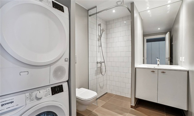 For individuals aged over 40 seeking a rental home with access to 450 square meters of shared communal spaces, Lunden offers an ideal living environment. This contemporary co-housing community is designed specifically for residents above 40, providing a unique setting that encourages active participation and transforms neighborhood relationships into genuine community bonds.The residence is positioned in the foremost row facing Kalvebod Fælled, presenting uninterrupted views over lush meadows. Inside, the layout includes a cozy open-plan kitchen and living area where the evening sun can be enjoyed from a spacious balcony. The home features a generous bedroom fitted with a sliding door and a built-in wardrobe. A large bathroom is adorned with elegant tiles and includes a separate shower area along with a laundry setup.