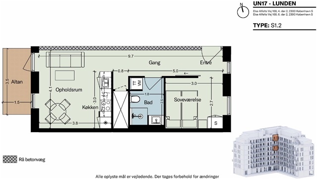The residence is positioned in the front row facing Kalvebod Fælled, offering unobstructed views of the lush meadows. Inside, you will find a cozy open-plan kitchen and living area where the evening sun can be enjoyed on the spacious balcony. The home includes a generously sized bedroom equipped with a sliding door and built-in wardrobe. The large bathroom is adorned with elegant tiles, featuring a separate shower enclosure and washing column.