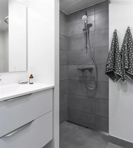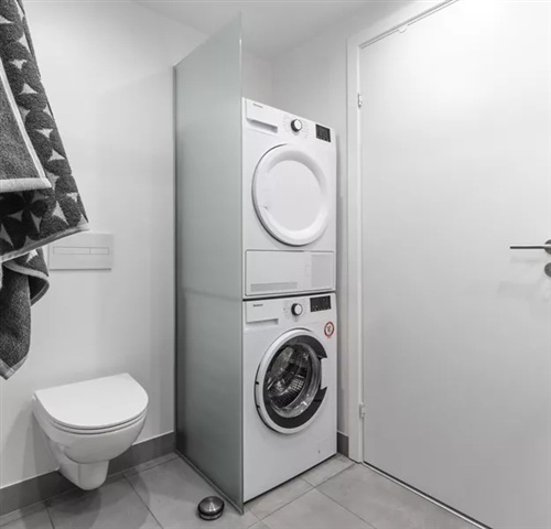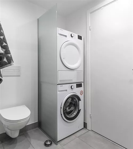 The bathroom boasts a clean and minimalist design, containing a shower enclosure, toilet, sink, and a storage cabinet. It is further fitted with a laundry column that includes both a washing machine and a tumble dryer. From the living room, there is direct access to your own outdoor terrace or balcony, providing a pleasant area to enjoy fresh air.