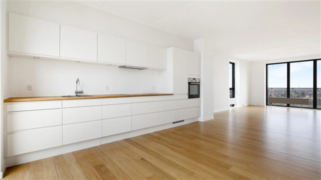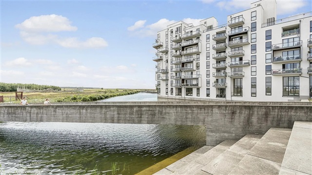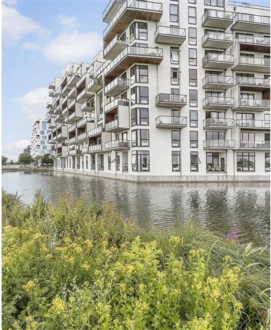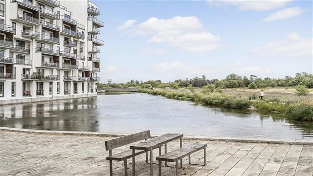 The building known as Stævnen is situated at the southernmost point of Ørestad, boasting unobstructed views over the protected natural area of Kalvebod Fælled. Surrounded by water to the east and south, the location naturally borders the meadowlands. Architecturally, Stævnen exhibits a bright and modern aesthetic, characterized by white plastered facades. The balcony frames contribute to each residence's distinctiveness, constructed from steel with wooden sections that provide a warm and welcoming visual effect. Built in 2009, the property offers a variety of amenities including a shared rooftop terrace, video surveillance, a courtyard playground, elevators in every staircase, storage units, video door phones, waste chutes, and secured bicycle storage in the basement.