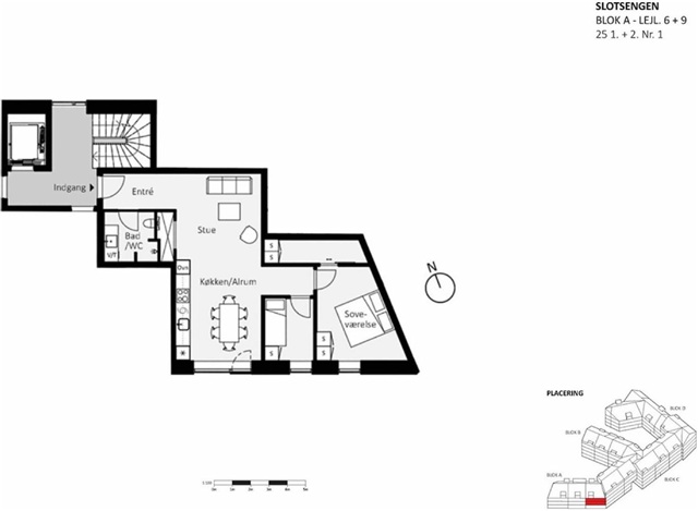 The apartments are thoughtfully crafted to foster a bright and welcoming environment, with expansive windows that allow ample natural light to fill the living spaces. Slotsengen stands as a symbol of both quality and comfort.Please be aware that the images provided might depict a different unit, so elements such as the interior layout, location, and views may differ. For the specific arrangement of this apartment, refer to the attached floor plan.