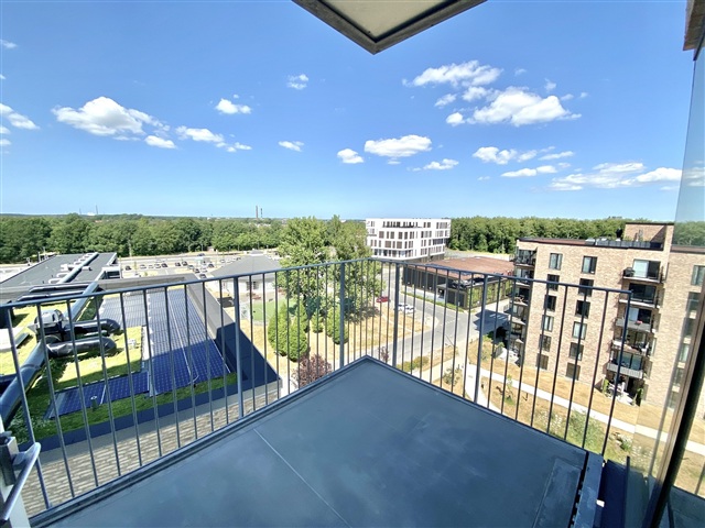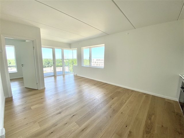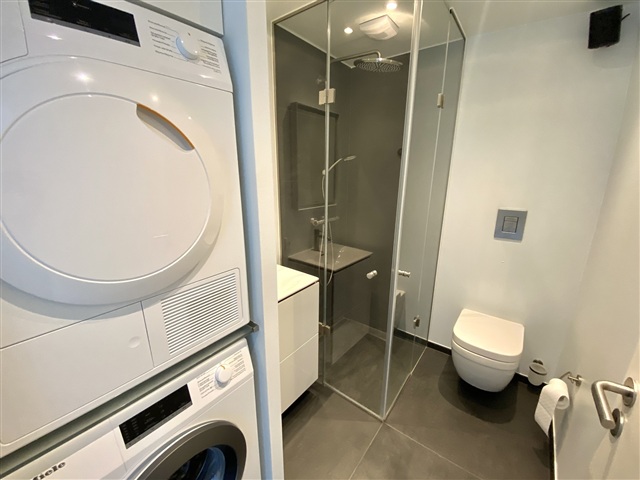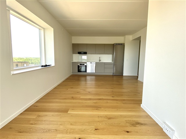 Situated within the rapidly evolving neighborhood of Munkebjerg Park, this bright and charming two-room apartment of 63 square meters is available for rent. It is positioned on the 8th floor of the tall building known as M Tower, offering residents a pleasant view. The building is equipped with an elevator for convenient access.Upon entering the apartment, you step into a hallway leading to a stylish tiled bathroom featuring a shower, wall-mounted toilet, and fixtures from Grohe. The bathroom is enhanced with underfloor heating, a backlit mirror, and a sink set in cabinets by Duravit. In one corner, a Sonos speaker is installed for quality sound, and both a Miele washing machine and tumble dryer are integrated within the space.