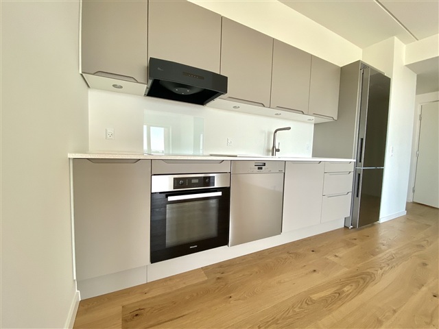 The kitchen, designed by Designa, presents a matte grey finish combined with a sleek Corian countertop. It is fully outfitted with Miele appliances. This kitchen seamlessly connects to a bright living room, which opens onto a spacious balcony. The bedroom contains built-in wardrobes, providing practical storage.