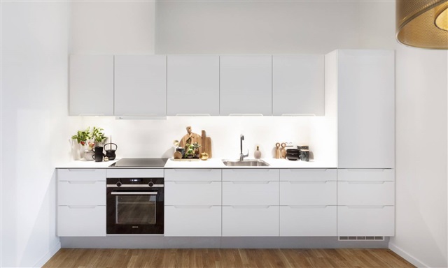 The apartments are characterized by their bright and spacious interiors, featuring lofty ceilings that create ample room for the entire household. They boast elegant oak parquet flooring equipped with underfloor heating, combining the warm aesthetic of wood with a surface that is both practical and easy to maintain-stains from jam or similar can simply be wiped away. These homes are particularly suited for style-conscious parents of young children. Each unit is furnished with the well-known, contemporary Invita Urban kitchen, complemented by fixtures from Hans Grohe, a brand recognized for its timeless and durable designs. The kitchens present clean, white surfaces with minimalist lines, while drawers and cabinet doors are fitted with soft-close mechanisms and integrated handles. All major appliances are seamlessly built-in.Considerable attention has been given to maximizing natural light and air circulation throughout the apartments. Every residence features large, bright glass sections alongside spacious balconies and/or compact gardens, enhancing the openness. The bathrooms maintain the same clean and straightforward design language found elsewhere in the home, with handle-free cabinetry from Invita and Hans Grohe fittings. The color scheme consists of soft gray and white tones. Light gray tiles adorn both the shower enclosure and floors, and the bathroom is equipped with a stacked washer and dryer from Siemens. Surface-level parking spaces are available for both cars and bicycles, while private storage rooms are allocated in the basement for all units.