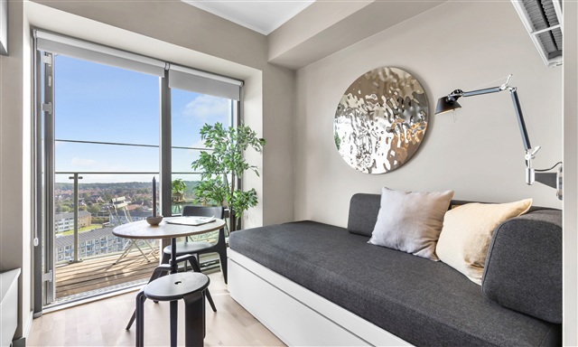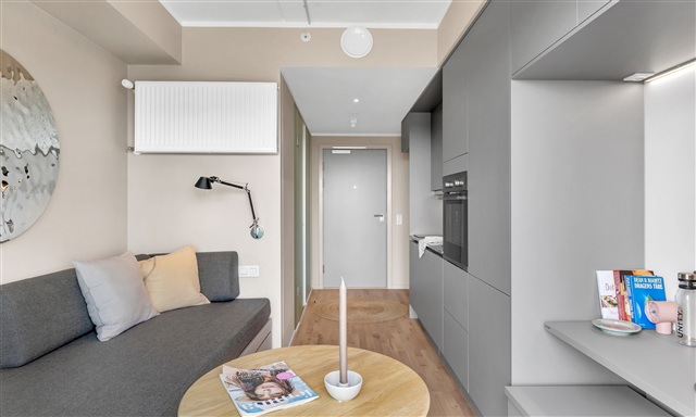 This uniquely designed studio apartment offers a range of practical features along with a generously sized balcony. The kitchen is sleek and efficiently laid out, featuring numerous cabinets for storage and equipped with a full set of modern appliances, including a dishwasher. Adjacent to the kitchen is a compact dining area complemented by an additional leaf, allowing for seating capacity to be expanded when needed. The bed within the unit doubles as a sofa bed, combining comfort with clever storage solutions. Ample storage space is provided through a combination of pull-out drawers and cupboards, ensuring plenty of room to keep belongings organized. Furthermore, the apartment includes a flexible desk that can serve either as a workspace or a cozy seating nook. The bathroom is spacious and fitted with tiled floors and underfloor heating; it also contains a separate shower stall lined with light-colored tiles. This apartment offers a truly well-considered living environment worth experiencing firsthand.