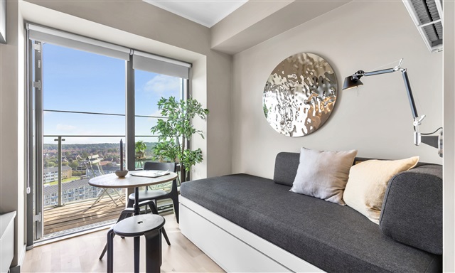 This uniquely designed one-room rental apartment offers a variety of practical features alongside a generous and inviting balcony. The kitchen boasts a sleek, modern design with an efficient layout, featuring numerous cabinets and comprehensive appliances, including a dishwasher. A cozy dining area is included, expandable with an additional leaf to accommodate more seating. The bed in the apartment serves as a sofa bed, combining comfort with clever storage solutions. Ample storage is available throughout the apartment in the form of drawers with click mechanisms and cabinets. Additionally, the unit is equipped with a flexible desk that can function either as a workspace or as a charming sitting nook. The bathroom is spacious, fitted with light-colored tiles and a separate shower enclosure, and also includes underfloor heating. This residence offers a blend of functionality and comfort that truly deserves a personal visit.