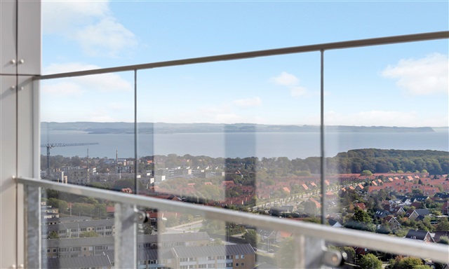 This uniquely designed two-room rental apartment features numerous practical elements alongside two delightful balconies offering stunning views. The open-plan kitchen and living area includes a cozy dining corner where the beautiful scenery can be appreciated. The kitchen is efficiently planned and comes fully equipped with all major appliances. The bedroom contains a 160x200 cm bed and TV, as well as storage solutions comprising two tall wardrobes with overhead cabinets and a desk. The bathroom is outfitted with underfloor heating, light tiles, and a separate shower area. Additionally, residents have access to the rooftop terrace on the 16th floor, which provides breathtaking vistas over Mols and the Aarhus Bay. This is a residence that truly needs to be experienced.