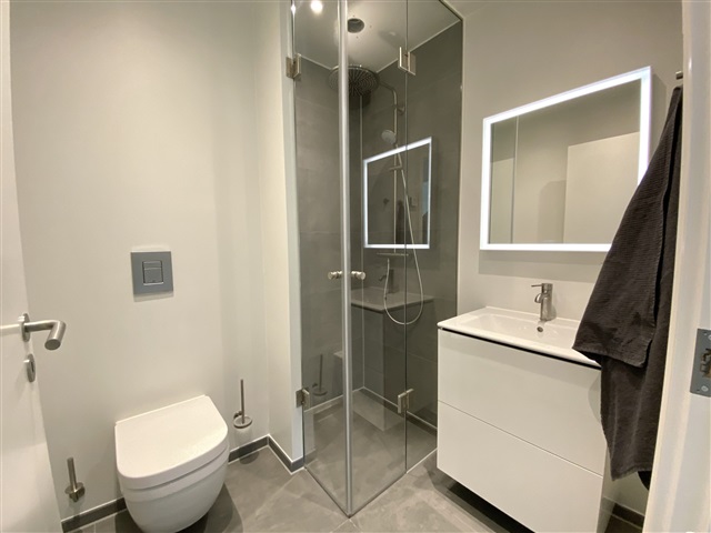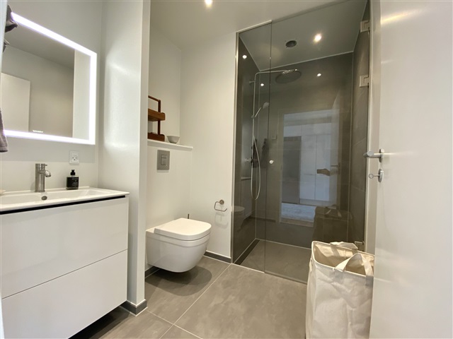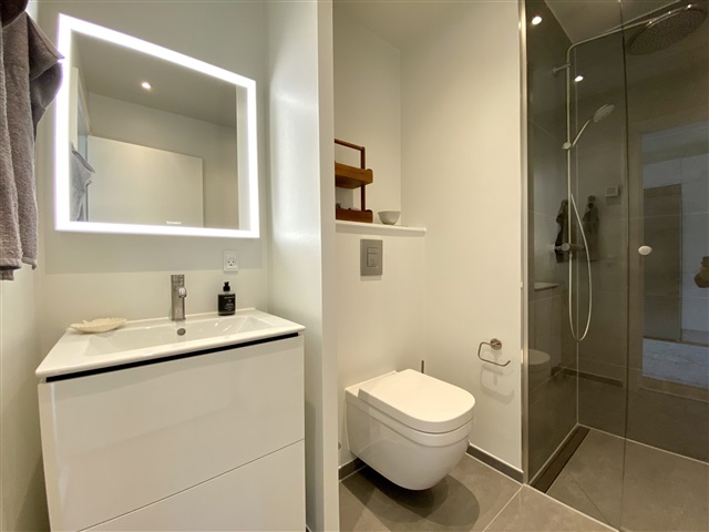 On the ground floor, a bathroom is fitted with a washbasin featuring spacious drawers by Duravit. A large illuminated mirror enhances the room, and a SONOS speaker is discreetly installed in the corner. The shower cabin boasts a premium Grohe rain shower, and the water is softened through an installed softening system that reduces limescale.