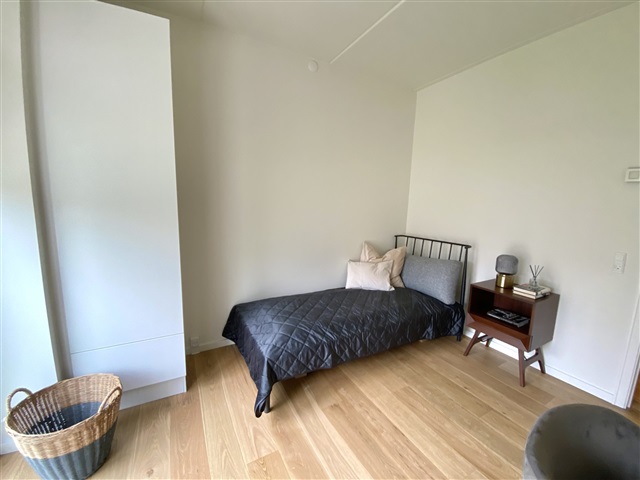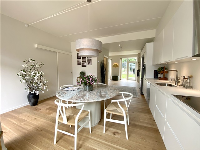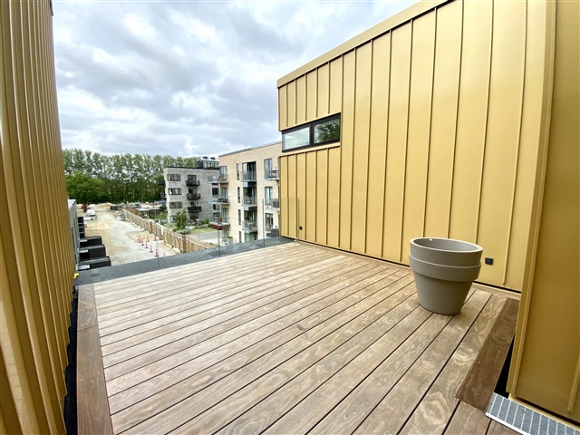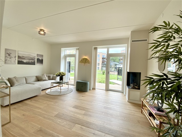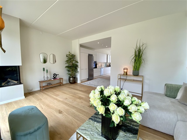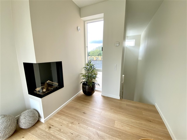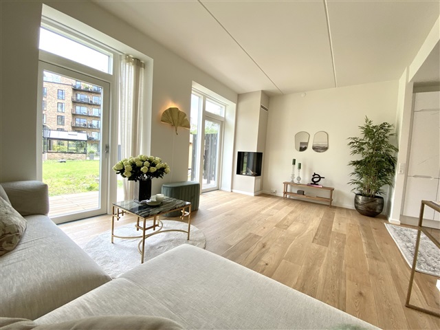 Situated within the desirable Munkebjerg Park, this attractive terraced house offers five rooms spread over 155 m² across three levels. Upon arrival, a pleasant front terrace welcomes you, complete with convenient access to a garden shed.Entering the home, you step into a spacious open-plan kitchen and dining area featuring a sophisticated matte white Designa kitchen, complemented by a luxurious Corian countertop. The kitchen is fully equipped with high-end Miele appliances, including a fridge/freezer, dishwasher, built-in oven, an 80 cm induction cooktop, and an elegant wine cooler. The space is generously sized, ideal for accommodating a large family or guests. The open concept seamlessly connects the kitchen to an expansive living room, where a beautiful gas fireplace from Living Flames provides warmth and ambiance. This living area also opens onto a large wooden terrace, perfect for outdoor enjoyment.