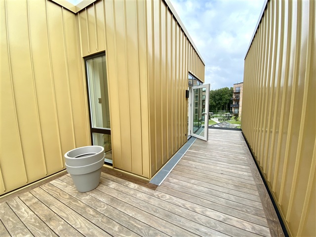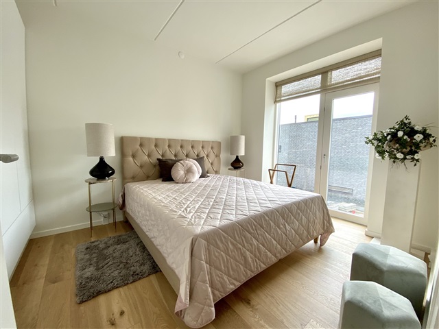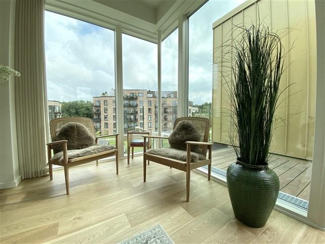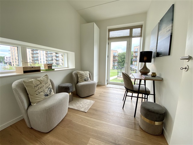 The surrounding area boasts a delightful playground for children, parking spaces including electric vehicle charging stations, and extensive green spaces featuring fountains, walking paths, and a football field. Munkebjerg Park benefits from its proximity to local amenities, with the town center situated 4 kilometers away, while the E20 motorway and light rail are accessible within 2 kilometers.