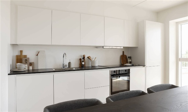 The apartment welcomes you with a separate and bright entrance area that offers ample space for hanging coats. From this entrance, two well-arranged rooms are accessible, each featuring built-in wardrobes and enough room for both a bed and a desk. The bathroom, also reached from the hallway, boasts a spacious and timeless design, complete with a separate shower area and equipped with both a washing machine and a dryer. Additionally, the apartment includes a large bedroom accommodating a double bed, providing direct access to a storage room that can conveniently be converted into a walk-in closet if desired. The open-plan kitchen and living area is filled with natural light and showcases a modern white kitchen outfitted with a fridge-freezer, oven, hob, extractor fan, and dishwasher, along with generous storage options. The square-shaped living room is designed to maximize usability, allowing for both comfortable seating and dining arrangements. From here, you step out onto a substantial west-facing balcony, ideal for enjoying sunlight and fresh air.Throughout the apartment, underfloor heating is installed and can be regulated separately in each room.