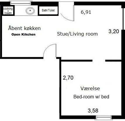 The apartment consists of: 2 rooms, 1 bedroom and a living room w/ open kitchen and separate bath and toilet. Partially furnished. Easy to maintain.