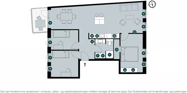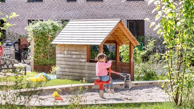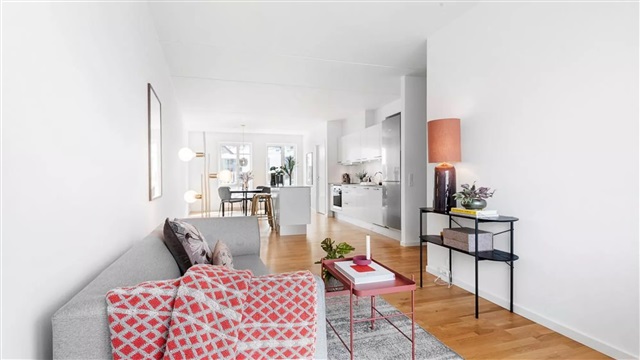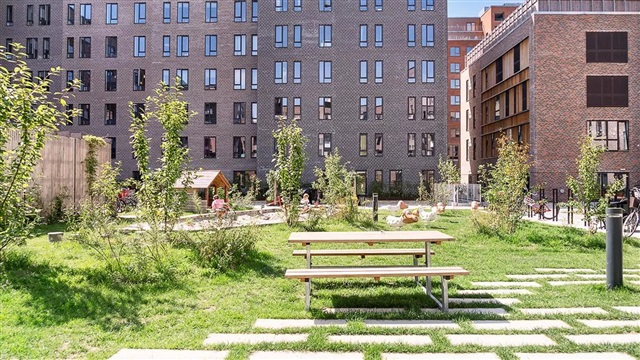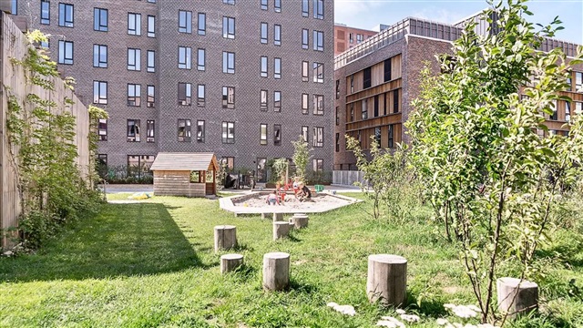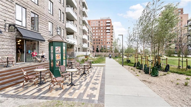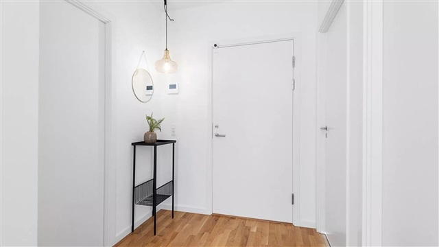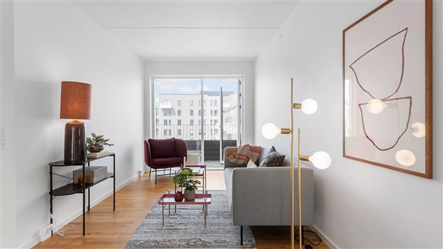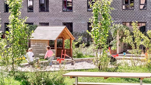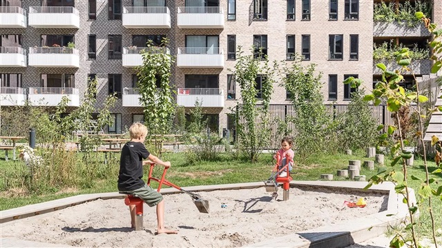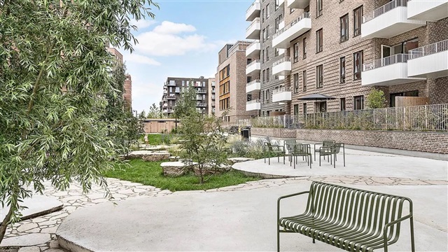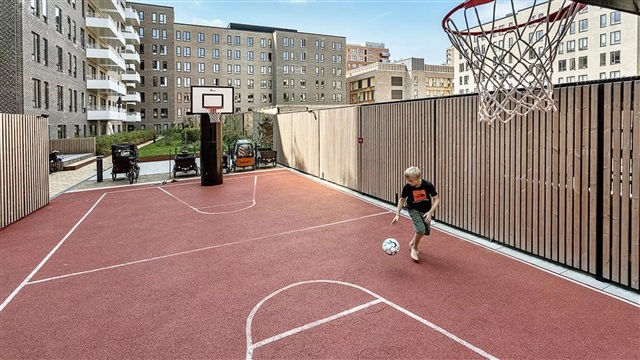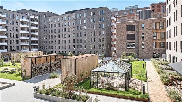 The building known as Bastionen showcases a distinctive architectural design created by the award-winning firm Danielsen Architecture. Its façade is distinguished by the characteristic Winter Gardens, which draw visitors into a verdant courtyard. Plant species native to the nearby Kalvebod Fælled have been incorporated into the courtyard and balconies alike, contributing to wind protection and the creation of a natural refuge. The southwest corner of Bastionen has been deliberately constructed lower than the rest of the building to maximize sunlight in the courtyard and to optimize views of the surrounding natural amenities such as Skovrummet and Fælleden. This lowered section also ensures that apartments receive an abundance of daylight. The courtyard's lush and varied landscaping provides cozy nooks for relaxation as well as natural play areas featuring tall climbing trees, gentle hills, and meadow grasses suitable for hide-and-seek games. Additional facilities within the courtyard include a greenhouse, a basketball court, and a covered zone designated for bicycle parking. The property offers amenities such as an elevator, a door phone system with a camera, and the opportunity to lease a parking space in the basement.