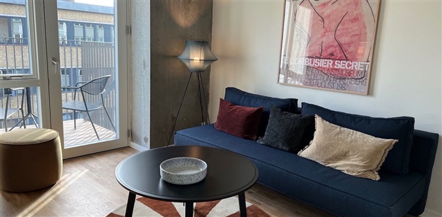 This one-room apartment features a balcony and offers direct access from the main entrance into the kitchen area, which is equipped with cabinetry from Svane Køkkener. Each unit contains its own microwave, a ceramic glass cooktop with two burners, and a compact refrigerator that includes a freezer compartment. All appliances are supplied by Siemens, complemented by a Thermex range hood. The apartment also includes a small storage room and a bathroom with a private shower. Additionally, fiber-optic internet is installed.Shared facilities include a communal kitchen on the first floor, where large fridge-freezers and well-appointed cooking stations are available, along with a shared dishwasher. A communal laundry room is also situated on the first floor, offering both washing machines and tumble dryers for use at an additional cost. On the roof, residents have exclusive access to a spacious shared terrace designed for relaxation, socializing, and gatherings. Please note that the floor plan provided is for guidance only, and the photographs may not exactly represent the specific rental unit. Viewings of all apartments take place during open house events or can be arranged individually.