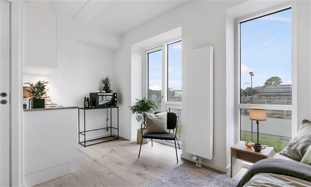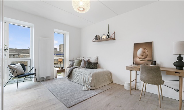 Situated in the modern neighborhood of Poppelstykket in Copenhagen SV, this apartment offers a bright and functional living space. The well-designed studio efficiently combines sleeping and living areas within a single room, maximizing the use of available space.