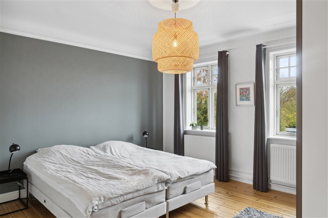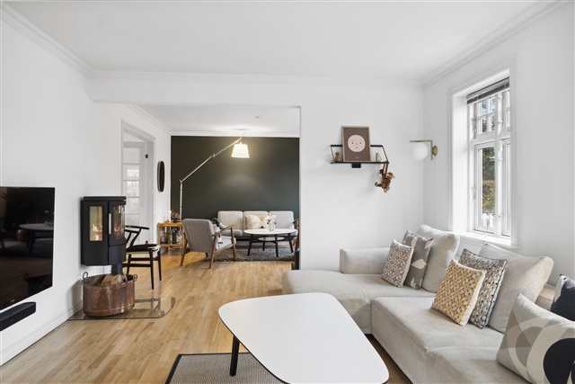 Located on Niels Bohrs Vej, this exquisitely renovated villa from 1920 presents a spacious three-story home situated in the heart of Viby J, near the tranquil and sought-after Kongsvang area. Nestled within a well-established residential neighborhood, the property combines the original architectural charm from its early 20th-century foundation with modern updates made in 2007, preserving the authentic character both inside and out.The house enjoys a highly private setting, positioned at the rear of the lot and set back from the quiet street, shielded by tall hedges and mature trees. A subtly winding, privately paved driveway illuminated by lamps runs alongside the expansive lawn, guiding you from the asphalt road up to the residence. Parking is available in the attached garage as well as on a courtyard capable of accommodating several vehicles.