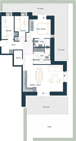 Welcome to In Lunden in Kirkebjerg Søpark you will find rental apartments with 2-4 rooms spread over 60-108 square meters. Flexible and modern floor plans ensure that you get the most out of your square meters, so whether you are single, a family with children or a senior, there is room for everyone to thrive. The heart of the home is the large kitchen-dining room with space for cozying up and spending time with friends and family, and from the living room there is access to your own private balcony, terrace or garden with a view to either the south or west. In Lunden's courtyard you will find light-filled trees and a path of slightly raised walkways. Tall meadow grasses, smaller bushes and trees create cozy, sheltered living nooks, where there is space for both spending time with family and neighbors, and space for contemplation on your own. When you live in Lunden, you live close to Kirkebjerg Søpark's two parking garages, so you can easily get the day's shopping and luggage from the car to the home. And in the parking garage you also have the opportunity to charge your electric car. Do you use pedal power instead? Of course, there is also plenty of bicycle parking close to your home. Please note that the floor plan is indicative and the pictures of the home do not necessarily correspond to the rental in question.If you want to read the description in its original language that is also possible. Read original description