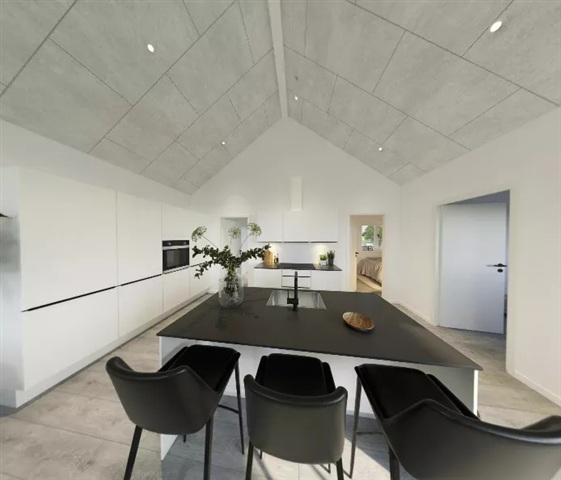 Entering the home, one finds a generous hallway offering ample storage for footwear and outerwear, as well as housing for a washing machine and dryer. The residence has been thoughtfully crafted to promote comfort and wellbeing, featuring floor heating connected to district heating and ceilings clad in Troldtekt panels, which enhance the indoor acoustics.