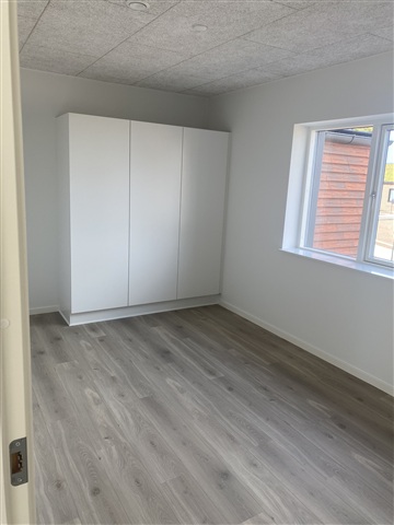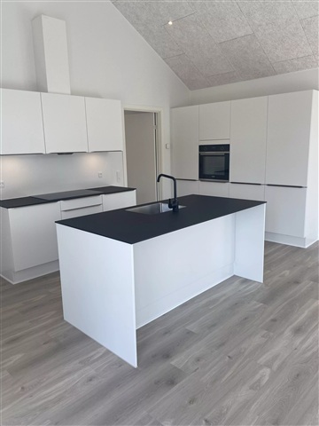 Situated in Fredericia’s Skovhusene development, this townhouse ranks among the most prestigious in the Triangle Region. The residence features three rooms, including a spacious open-plan kitchen and living area designed to foster gatherings with family and friends. The kitchen is equipped with a contemporary white Invita design, complete with a pyrolytic oven, an induction cooktop, and a dishwasher.In addition to the living space, the property contains a master bedroom along with a second room suitable for children or overnight guests. The living room benefits from expansive windows that frame views of the surrounding open fields and provide direct access to a private terrace.