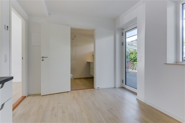 This apartment features high-quality materials combined with a sleek, modern design. The bathroom is bright and prepared for a washing machine connection. The kitchen offers enough space for a dining area without sacrificing its overall size. The layout of the apartments is efficient, making them well-suited for shared living arrangements. Additionally, underfloor heating is installed throughout the entire residence. Large windows allow for abundant natural light, creating an open and welcoming atmosphere. Each unit includes access to either a spacious terrace or a balcony.Constructed in 2017, the building provides bicycle parking and a private storage room located in the basement. Residents also benefit from free parking spaces associated with the property. The apartments enjoy convenient proximity to both light rail and train stations, along with easy access to shopping facilities. Aarhus Business Academy is within walking distance, offering a highly practical location with straightforward routes to the city center of Aarhus.