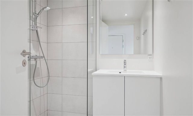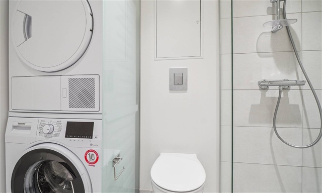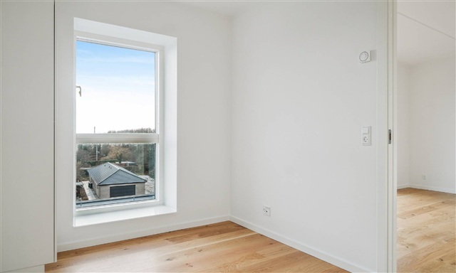 This charming and efficiently designed apartment welcomes you with a bright entrance hall offering ample space for storing outerwear. From here, you have direct access to a generously sized bedroom that easily accommodates a large bed. Adjacent to this bedroom, a storage room is available, which can conveniently function as a walk-in closet should that be preferred. The entrance area also provides access to the bathroom, which features a timeless and elegant design. It is spacious and equipped with a separate shower area, as well as both a washing machine and a tumble dryer. The expansive, light-filled kitchen and dining area is furnished with a fully equipped white kitchen, including a fridge-freezer, oven, hob, extractor hood, and dishwasher, along with substantial storage solutions. The living room is thoughtfully arranged, allowing for versatile use with well-planned zones for both a seating area and dining space. This room extends onto a large south-facing balcony where sunshine and fresh air can be enjoyed, as well as views over the nearby villa neighborhood. From the living room, you also access the apartment's second bedroom, which offers enough room for both a bed and a desk.Throughout the apartment, underfloor heating is installed, with temperature controls individually adjustable for each room.