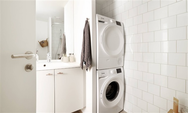 The bathroom is finished with attractive, light-colored tiles, contains a separate shower cabin, and is equipped with both a washing machine and a tumble dryer.
