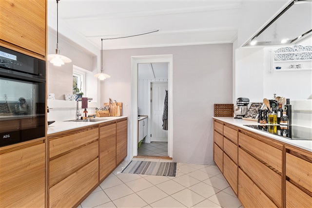 Well-arranged floor plan without wasted space. Open connection between the living room and the kitchen, which creates a light and inviting atmosphere. Many windows that draw in daylight. In addition, a bright bay window. The delicious joinery kitchen stands out with elements in elm wood and Corian countertops. Ample storage space and white goods, dishwasher and hot air oven at ergonomic height. New bathroom under construction with shower section, a room and a utility room with a new washing machine and tumble dryer. Underfloor heating throughout the ground floor. On the first floor, a room and a living room, which have a good ceiling height, wide windows and a glass bay window, which ensures both a lovely light and a beautiful view of the sea.