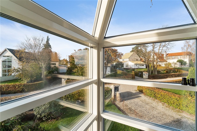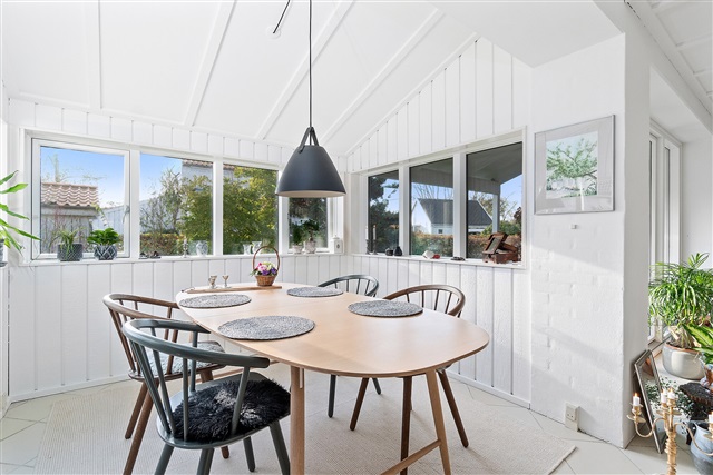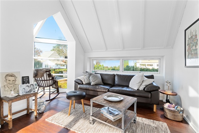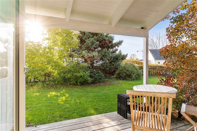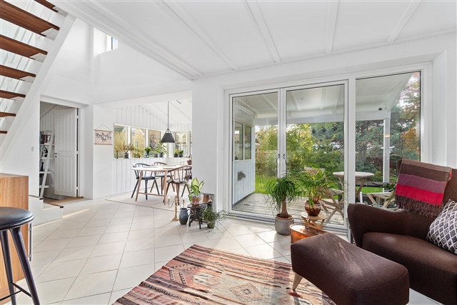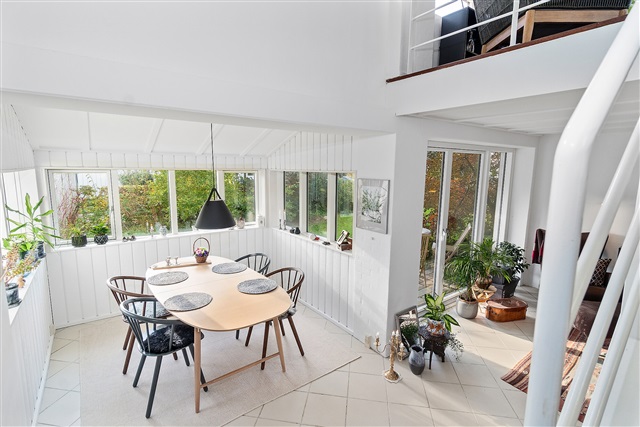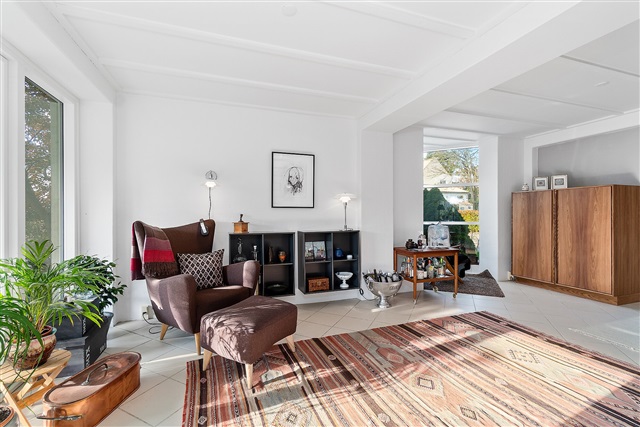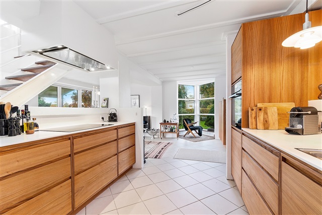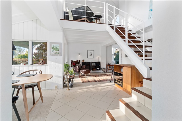 2 living rooms, 2 bedrooms, 2 floors, 2 terraces.With an exciting interior design, high ceilings and wonderful light, you get excellent settings on a closed, private road in Ålsgårde. The property from 1987 was designed by architect Kim Utzon. It is in really good condition and has been carefully modernized with, among other things, a new bathroom, new triple-glazed windows and doors. In addition, a carport + barn and a shed.