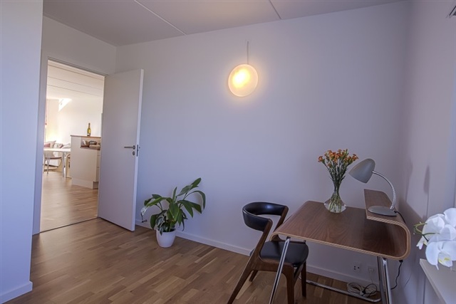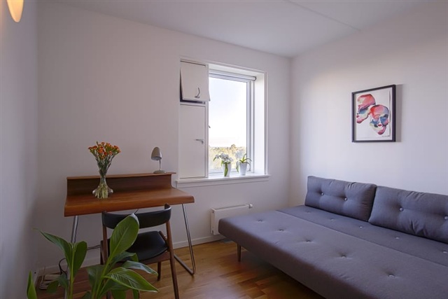 The area is green and surrounded by water, and there is free street parking. It takes 10 minutes to cycle to Nyhavn and 10 minutes to Amager Strand, and bus no. 2A stops five minutes from the door.