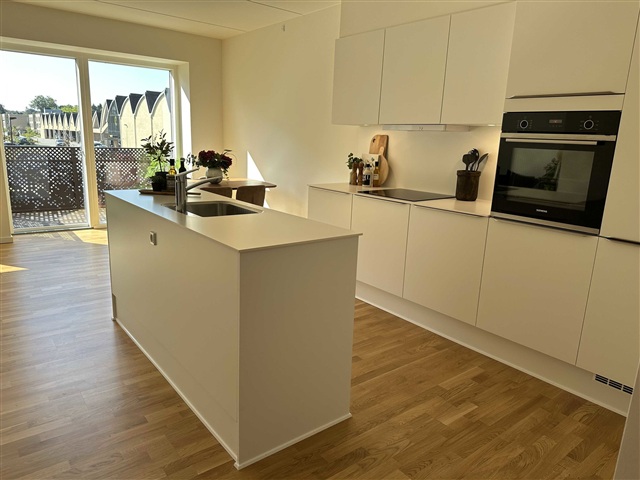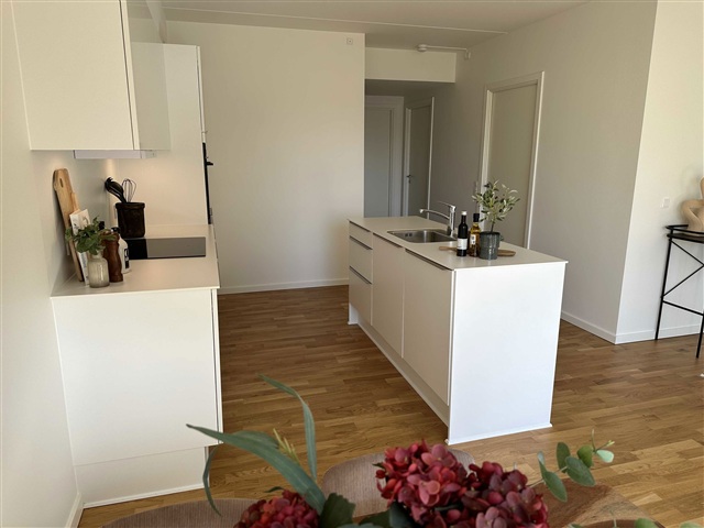 Access to the outdoor area is gained directly from the kitchen-living room, creating a seamless extension of the living space-ideal for enjoying morning coffee or relaxing outdoors. In summary, this contemporary and well-laid-out three-room apartment is located on the second floor. It boasts a generous kitchen-living room, two well-sized bedrooms, and additional storage, offering a tranquil, light-filled space well suited for everyday living. Residents have complimentary parking spaces available at Dalum Papirfabrik. Please note that the floor plan is indicative and may be subject to minor alterations. Furthermore, the images presented are not of this specific rental but represent a selection of photos from furnished model apartments.