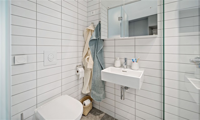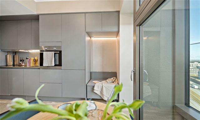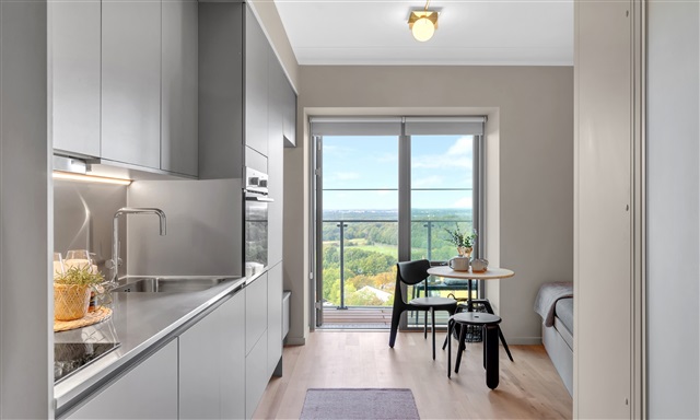 This uniquely designed studio apartment offers numerous practical features alongside a delightful balcony. The spacious interior includes an open-plan kitchen and living area, featuring a sleek kitchen equipped with modern appliances, including a dishwasher, and ample cabinetry for storage. A cozy dining nook is provided, complete with an additional leaf to expand seating capacity when needed. The bed within the unit doubles as a sofa bed, combining comfort with smart use of space and excellent storage capabilities.Storage is further enhanced with pull-out drawers and cupboards, ensuring plenty of room for belongings. Additionally, the apartment includes a versatile flex desk that can serve either as a workspace or a snug alcove. The bathroom is generous in size, fitted with underfloor heating, light tiles, and a separate shower enclosure. For those residing on the 18th floor or higher, there is access to a rooftop terrace located on the 16th floor, offering stunning views over Mols and Aarhus Bay. This property presents a living experience well worth exploring.