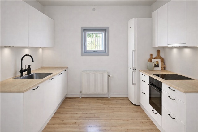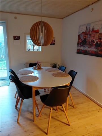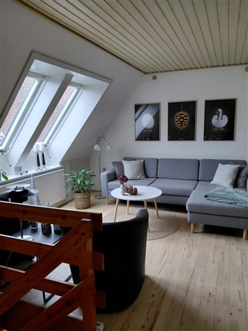 Located in the heart of Rudkøbing, this three-room apartment offers convenient proximity to shopping options and the charming pedestrian street. The unit is spread over two floors, with the ground level featuring an entryway complete with a built-in closet, a bathroom, a small utility room equipped for a washing machine, and an open-plan kitchen-living area adorned with wooden flooring that leads directly to a private garden. Additionally, there is a bedroom on this level, also with wooden floors and built-in wardrobes. Upstairs, the first floor comprises another bedroom with built-in closets as well as a living room, both fitted with wooden floors.Prior to moving in, a new kitchen and bathroom furniture will be installed, designed in the same style as seen in the accompanying photos. Residents have access to a communal courtyard and laundry facilities, along with their own storage shed. Please note that pets are not permitted.