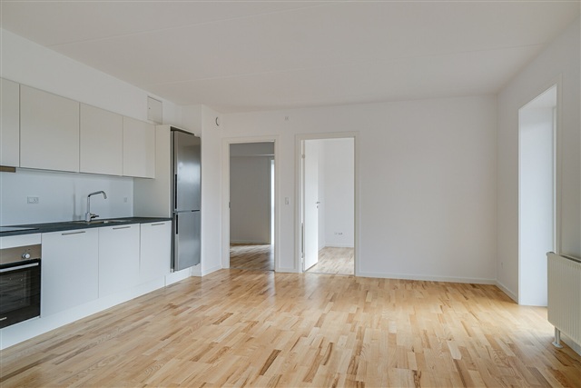 This three-room apartment is situated on Marshalls Allé and features a bright, spacious living environment with direct access to a large balcony. Included with the unit is a built-in storage room measuring 1.6 square meters, alongside communal parking spaces for both cars and bicycles. Residents benefit from well-maintained shared amenities, including a children's play structure and benches with tables arranged invitingly throughout the grounds. The landlord maintains a high level of service for tenants.Notable details of the apartment include ash laminate parquet flooring and fitted furniture from Invita. Essential appliances are provided by Bosch, comprising a glass-ceramic cooktop, oven, dishwasher, and a combined refrigerator and freezer. The property is pre-equipped for a laundry column, and the bathroom is fitted with underfloor heating. Every unit in the building comes with either a balcony or terrace, and the complex is serviced by an elevator and equipped with a door phone system. Both communal car and bicycle parking are available on site.