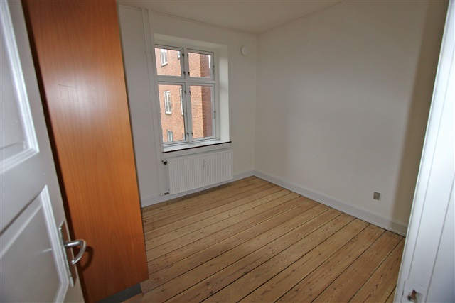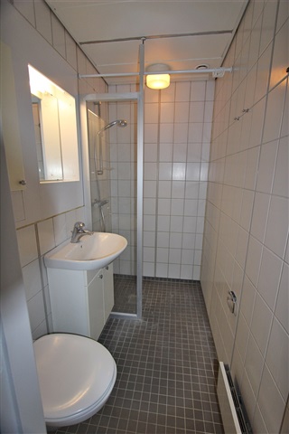 The apartment features bright, recently renovated interiors with whitewashed plank flooring throughout both the living room and bedroom. The kitchen is well-lit and equipped with beech cabinetry, including a compact dining area. The bathroom is tiled with white tiles on the walls and gray tiles on the floor, and it includes a glass partition separating the shower area. Pets are not permitted.