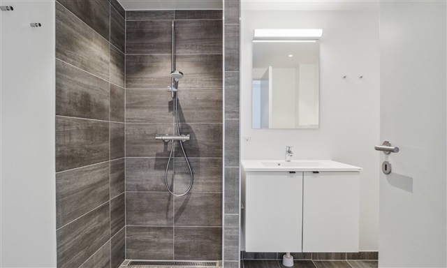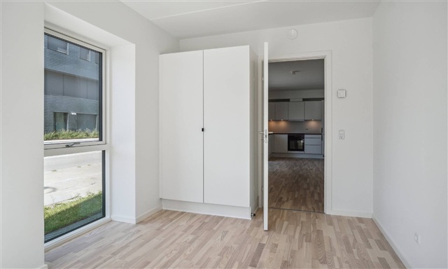 Situated within one of the architecturally striking buildings in Egedal's emerging neighborhood, the apartment offers proximity to the town while being surrounded by nature. The buildings are nestled amid lovely green lawns, and covered bike shelters are available for convenient bicycle parking.