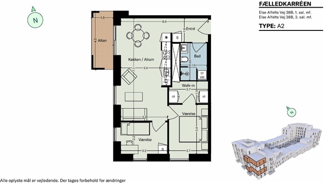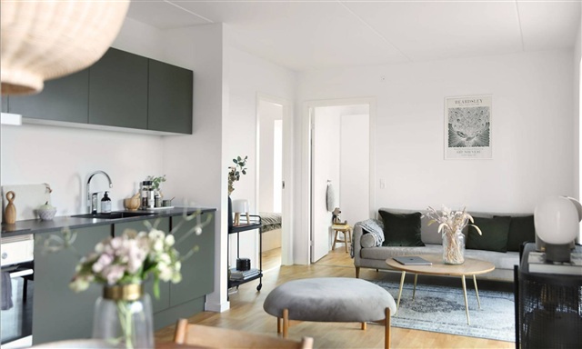 This residence features a beautifully designed olive green Invita kitchen that imparts a serene and natural atmosphere throughout the home. The floors are crafted from oak, complemented by underfloor heating installed across every room, ensuring consistent comfort no matter the season. Within the property, you will find two spacious bedrooms, a combined kitchen and living area, and a generously sized bathroom. The appliances, all provided by Electrolux, accentuate the modern feel; the bathroom continues the olive green theme, lending a cohesive touch to the overall interior. Additionally, the bathroom is equipped with an Electrolux washer and dryer. Ample storage is available via built-in closets, and each unit benefits from a dedicated storage room located either within the apartment itself or in the basement.The building known as Fælledkarréen stands out due to its exceptional architectural design and remarkable views overlooking Kalvebod Fælled, fostering a strong sense of community among residents. At the pinnacle of this distinguished structure, there are two expansive south-facing communal rooftop terraces that offer uninterrupted vistas of the surrounding natural area. These terraces provide an ideal setting to enjoy the outdoors from sunrise to sunset while encouraging neighborly connections.