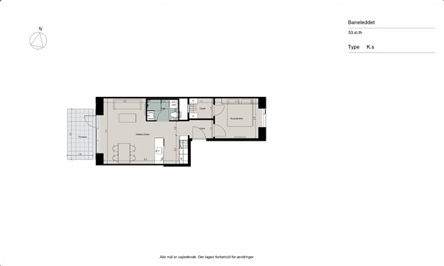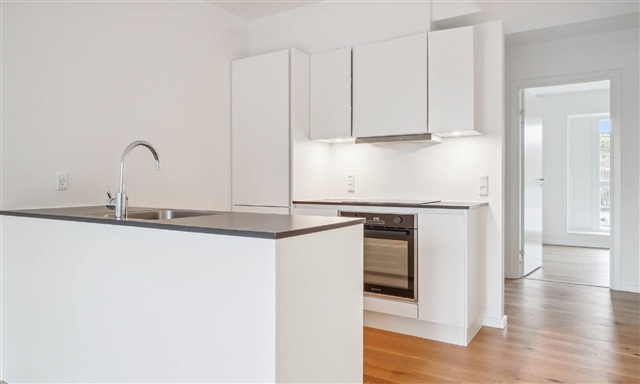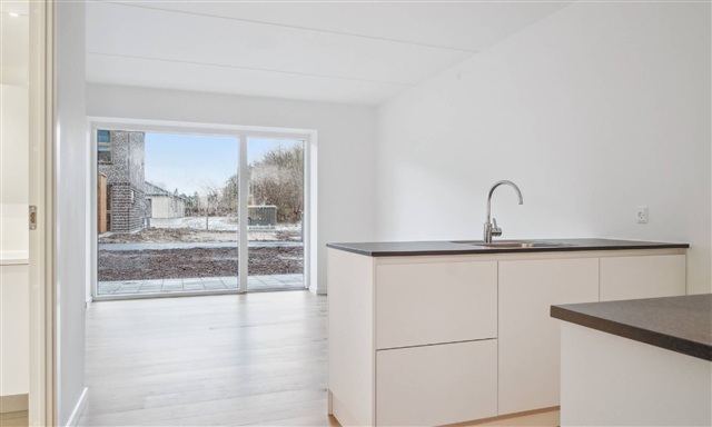 This beautifully designed and optimized apartment welcomes you into a bright entrance hall that leads directly to a spacious bedroom, big enough to accommodate a large bed. From the bedroom, you have access to the apartment's storage room, which can easily be transformed into a walk-in closet if preferred. The large, light-filled kitchen and dining area feature a modern, fully equipped white kitchen including a fridge/freezer, oven, stovetop, extractor hood, and dishwasher, along with ample storage space. Adjacent to the kitchen is the bathroom, designed with timeless elegance, offering generous space and a separate shower area, complete with both a washing machine and a tumble dryer. The living room is thoughtfully arranged to provide flexible use, allowing for both a sofa area and a dining section to be comfortably accommodated. It opens onto a west-facing terrace where you can enjoy sunshine and fresh air while overlooking the nearby residential neighborhood consisting of villas.Throughout the entire apartment, underfloor heating is installed with individual controls in each room, allowing for personalized comfort.