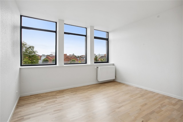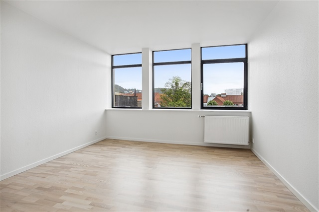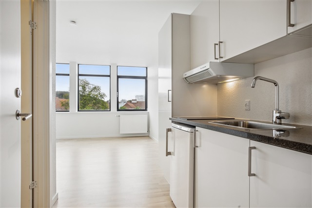 This newly renovated studio apartment is located in the heart of Vejle and is ready for immediate occupancy. The unit features a bathroom equipped with underfloor heating, a washing machine, recessed lighting, a wall-mounted toilet, and a pleasant shower area. The spacious main room is directly connected to the kitchen, which includes a ceramic cooktop, a refrigerator with a freezer compartment, and a range hood. Residents also have access to a large communal terrace. Parking spaces are available for rent close to the building. Viewings are offered every day of the week, so feel free to reach out to schedule a visit.