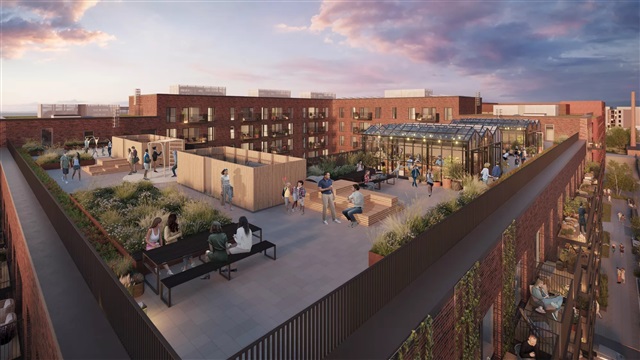 A sense of community is encouraged both indoors and outdoors within the building. On the ground floor, there is an inviting shared courtyard featuring seating areas and a playground. At the rooftop level, residents have access to a garden with fitness facilities, orangery spaces, and a lookout point offering an expansive view of the surroundings. Additional amenities include a bike workshop, stroller parking, and an exchange center for residents' convenience.
