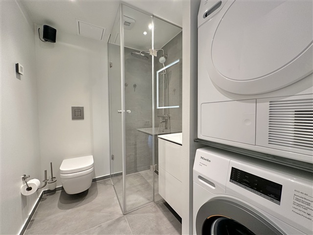The bathroom features tasteful tiles and a shower stall equipped with Grohe fixtures and sanitary ware, complemented by bathroom furniture from Duravit. Additionally, a private washing machine and dryer are included.