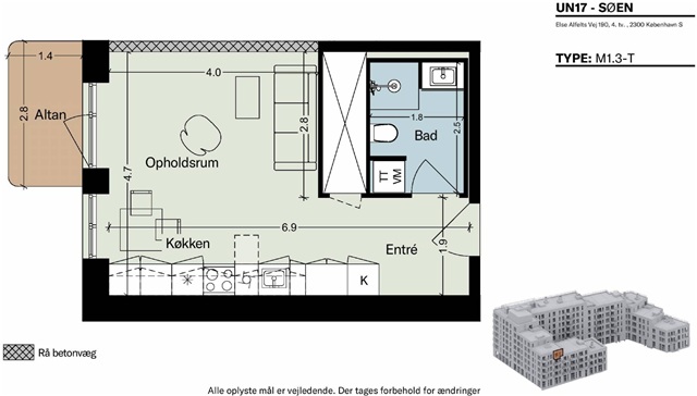 This bright and well-arranged studio apartment offers a well-thought-out layout and is situated in the building known as Søen, positioned directly adjacent to Kalvebod Fælled. The residence features large windows that allow plenty of natural light to fill the space while providing views of the stunning surrounding nature. The interior includes elegant oak parquet floors and underfloor heating throughout.The kitchen, designed by Rotpunkt, is finished in a warm gray tone and equipped with all necessary appliances: an induction cooktop, refrigerator with freezer compartment, built-in oven, and dishwasher. From the spacious kitchen-living area, there is access to a charming balcony where one can enjoy the views of the natural landscape and outdoor life.