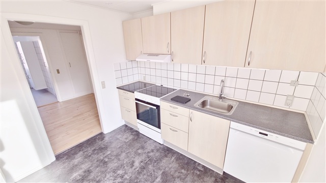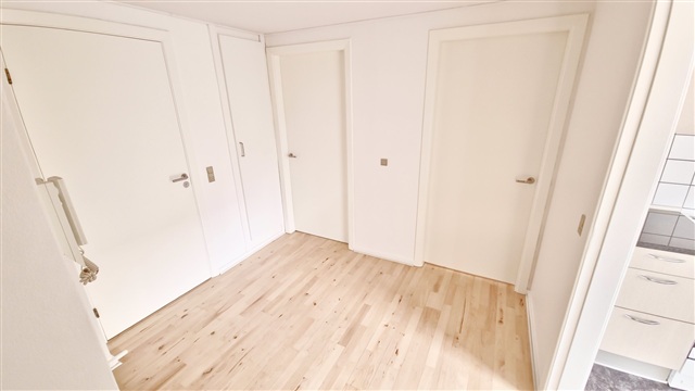 This bright and attractive apartment features lacquered beech parquet flooring in the hallway, living room, and bedroom. The spacious entrance area includes built-in wardrobes, while the generously sized kitchen is filled with natural light and equipped with beech wood cabinetry and a dining area. The large bathroom boasts white tiles on the walls and cabinetry made from white-pigmented beech. The bedroom offers ample closet space. Pets are not permitted in the residence.